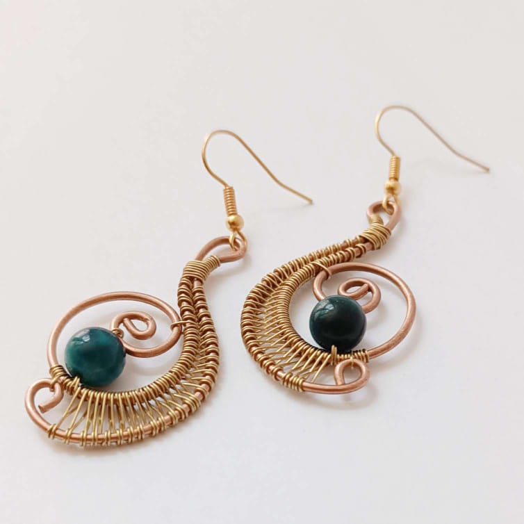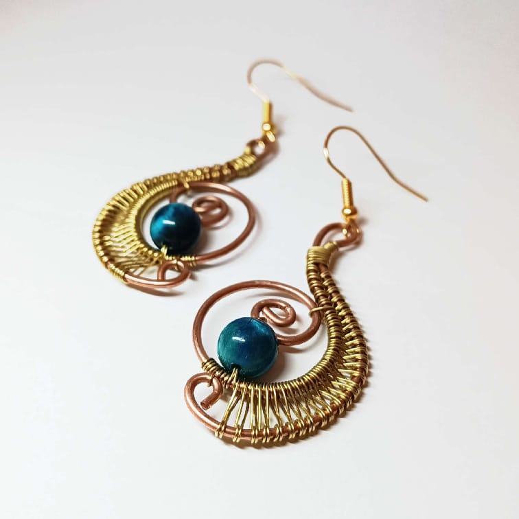 Ces boucles sont ornées de perles d’œil de tigre teintées de bleu enlacées dans un tressage de fils de cuivre et de laiton. Boucles légères avec accroches en acier inoxydable.