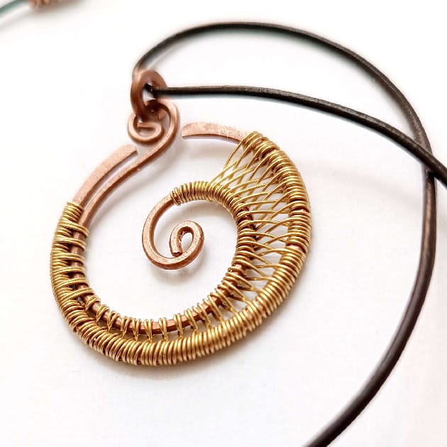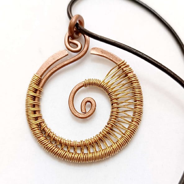 Ce pendentif est travaillé sur un enlacement simple avec des fils de cuivre, maintenu par un tressage de fils de laiton, soutenu par un cordon en cuir. Cette création a été réalisée sans perçage ni colle.