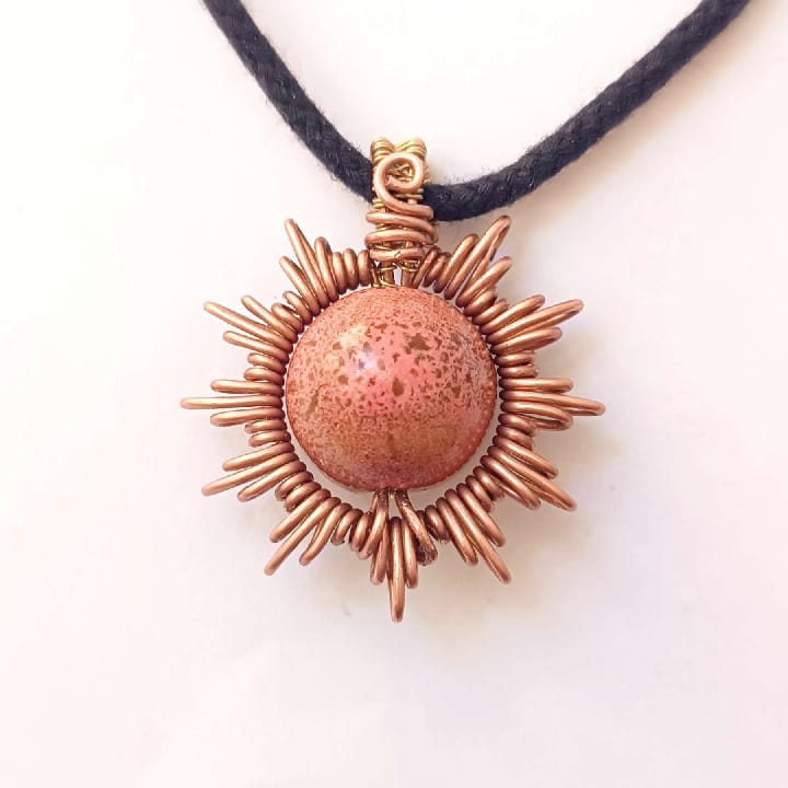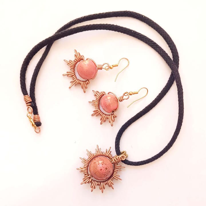 Cette parure comprend des boucles d’oreilles et un collier assorti. Les boucles sont composées d’un tissage de fils de cuivre avec des accroches en acier inoxydable. Le collier est fabriqué avec le même tissage de cuivre. elle comporte des perles de céramiques roses.